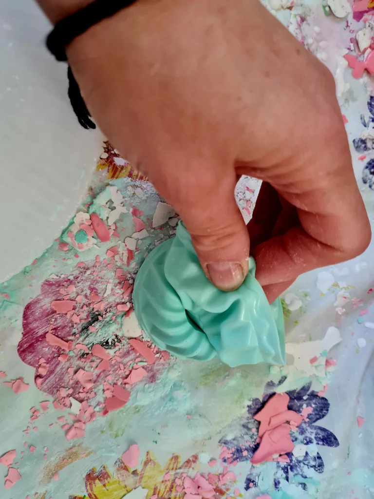 Die gut aufgerührte Gießmasse wird nun gleichmäßig in die Einfüllöffnung gefüllt. Anschließend müssen eventuelle Lufteinschlüsse und -bläschen vorsichtig ausgeklopft werden. Nun muss die Masse in der Form für mindestens 30 Minuten trocknen.